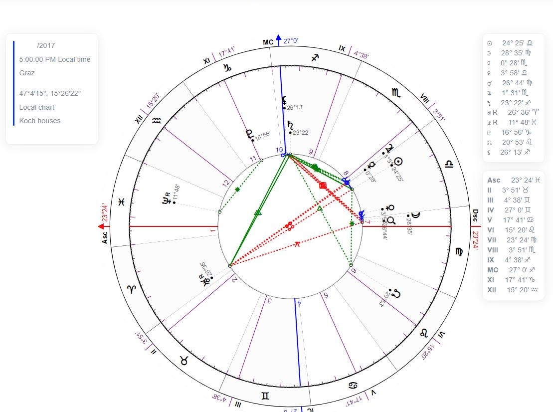 In the chart constructed for Graz, we see that the tense configuration has shifted to the 1st-7th house axis, indicating that there will be very intense relationships with others, including in personal life. The strength of the 7th house is 100 points, which is five times the average (where personal life is comparable to that of most people).