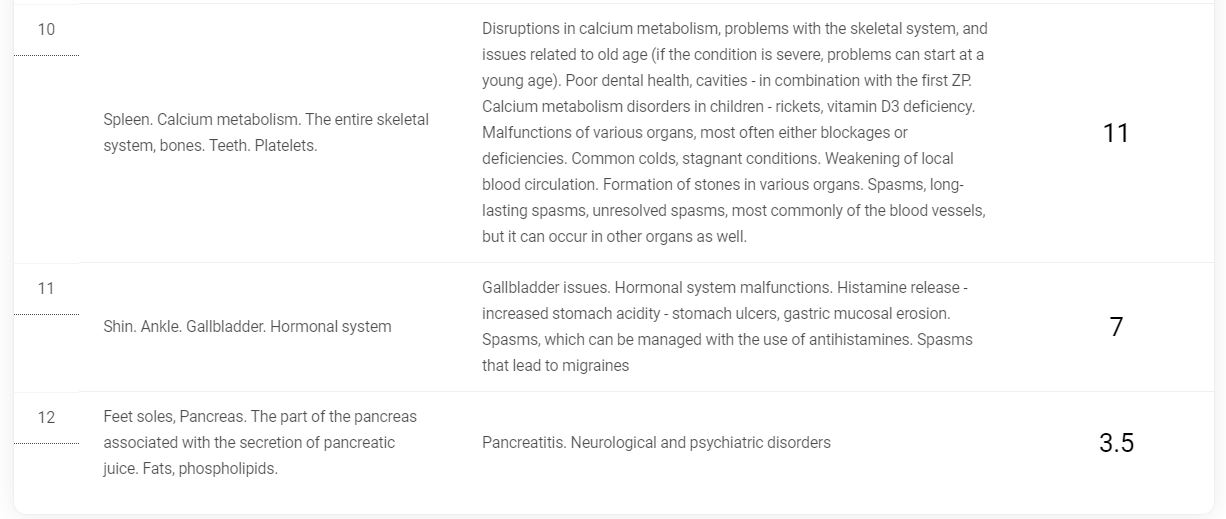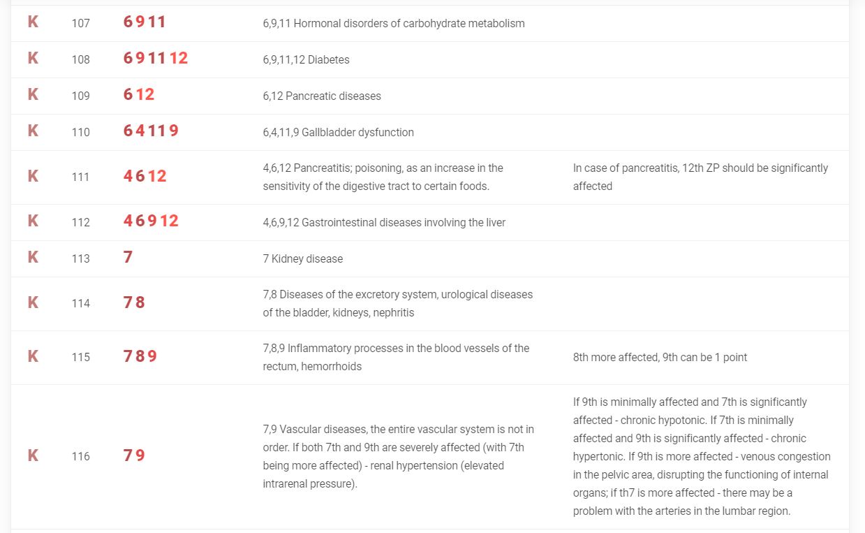 The 7th and 8th zodiacal principles are the most afflicted, with an alarming score of 13 points! This suggests that, among all potential health issues, special attention should be paid to diseases affecting the kidneys and excretory system, such as nephritis, kidney inflammation, and bladder infections.