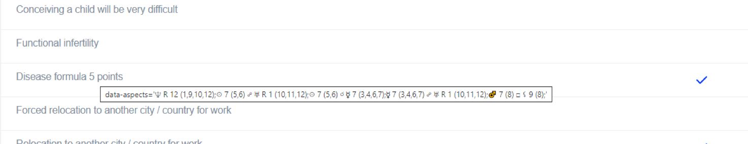 In her health chart, there are 15 aspects forming a disease formula. All zodiacal principles, except the first, are afflicted. This means that this girl may face almost any type of illness throughout her life.